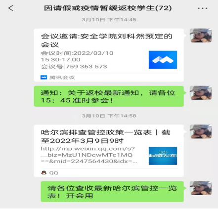 为精准安全有序做好常态化疫情防控形势下的员工返校工作,学院领导高度重视、提前谋划,把员工返校途中可能带来的疫情风险查在前面。2月12日,学院通过腾讯会议召开了2022年春季员工返校第一次班长工作会议。辅导员老师教育引导员工要认清当前疫情防控的复杂形势,从自身做起,连续十四天居家健康观测,严格遵守学校及属地关于疫情防控的管理要求,提前做好返校准备。2月22日,为准确掌握每名员工的行动轨迹、摸清底数、建立台账,做到全覆盖、信息准、无遗漏,学院分别召开了2022年春季学期开学班主任会议以及2022年春季员工返校第二次班长工作会议。党委副书记郑红岩在班主任会议上强调了学校疫情防控工作的重要性,要求全体班主任老师加强员工舆论引导,准确掌握每一名员工的行动轨迹,严格审批每一名员工的返校申请。辅导员刘科然、薛广鑫老师在班长会议上要求全体班长提高责任感、高标准完成信息排查工作。两名辅导员老师带领学院19名班长,连续7天,每日通过钉钉后台数据、员工自主上报、一对一询问等多种方式确保了对每名员工做到情况明、信息准、无遗漏,为员工安全有序返校做到了有力保障。