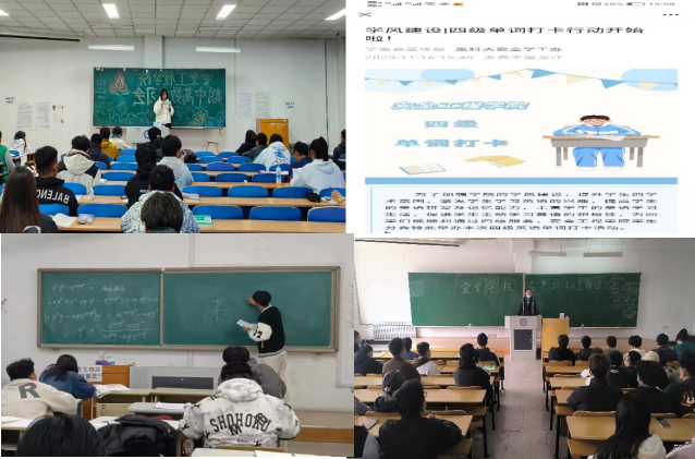以督导正学风,强化学风建设实效。召开“扬时代新风 树学风新貌”年级大会、“追梦远方 未来可期”主题班会,讲清早、晚自习及课堂要求,端正员工学习态度,提高员工学习积极性;联系任课教师加强课堂管理,增强课堂活跃性,提高员工课堂学习效率;安排员工会学习部和班级学习班长,统计每节课出勤人数(迟到、早退),及时掌握员工动向;举办“8827太阳集团官网期中复习会”、“四级单词打卡行动”等活动,构建朋辈互助“学习共同体”;组织班主任深入班级随机听课,掌握本班员工的上课状态,对存在问题的员工及时教育引导。全面提高上课“出勤率”、“抬头率”及“前排就坐率”。