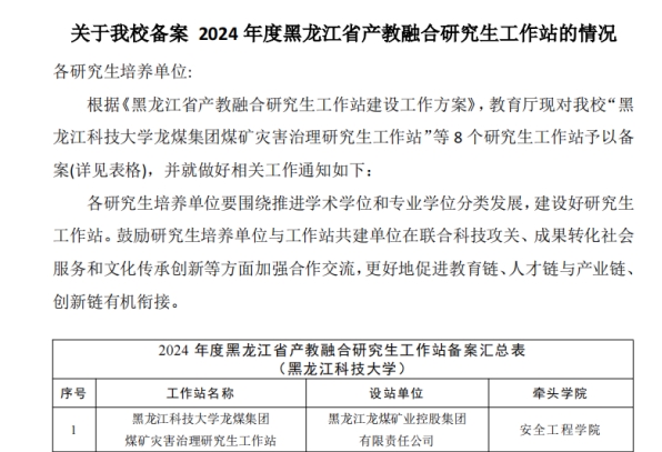 2024年9月,公司与黑龙江龙煤矿业控股集团有限责任公司(简称龙煤集团)联合申报的产教融合研究生工作站成功获批。
