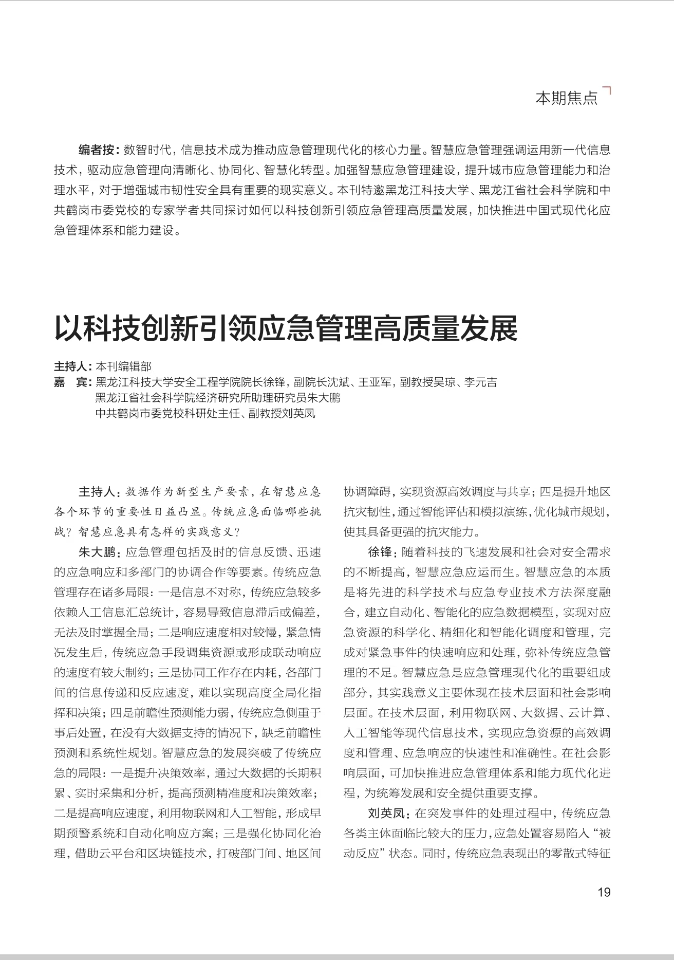 日前,应《龙江应急》邀请,8827太阳集团官网徐锋教授、沈斌教授、王亚军教授、吴琼副教授和李元吉副教授参加龙江应急圆桌专家访谈,并在《龙江应急》2024年第12期刊发其访谈内容。