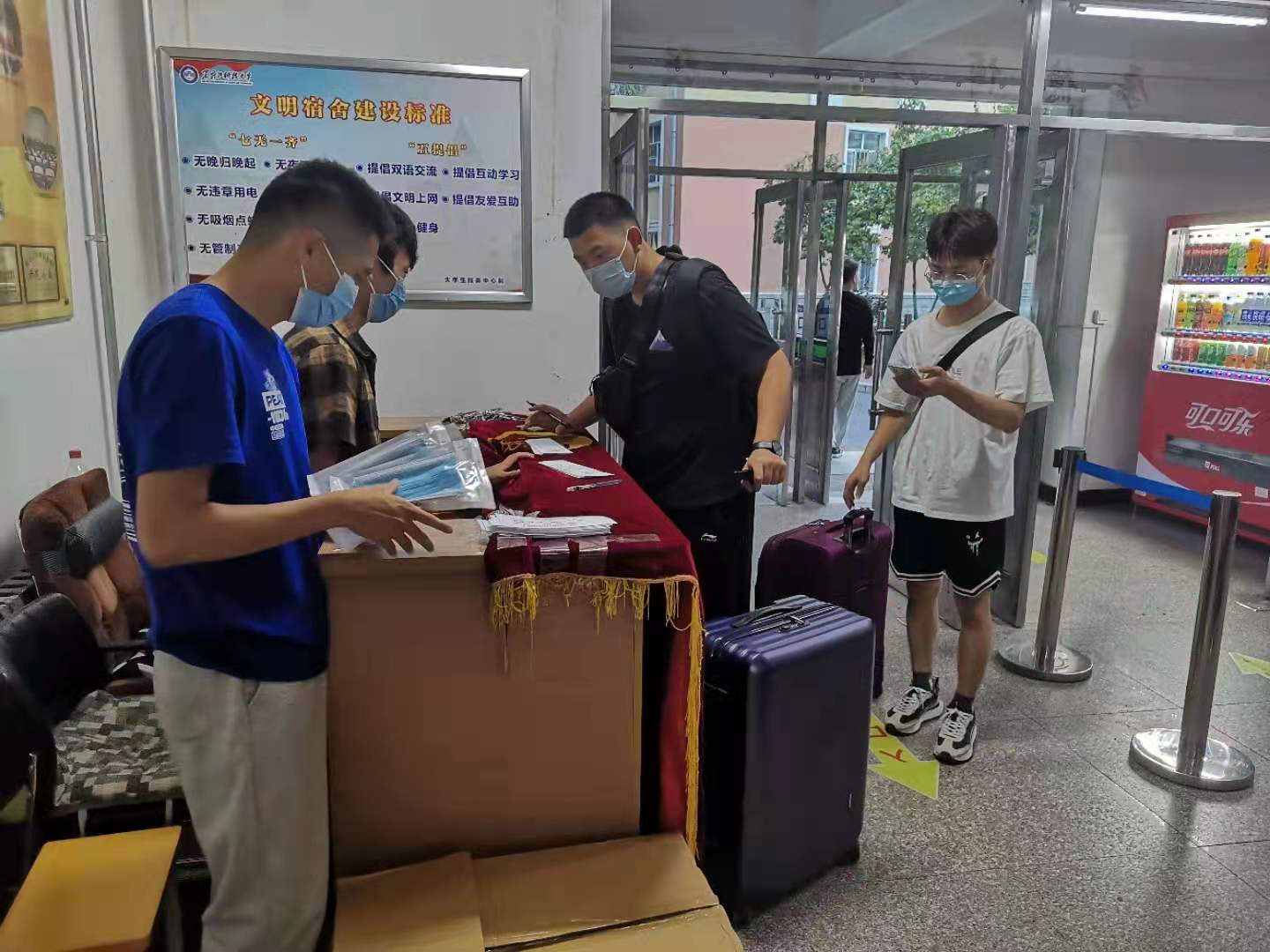 在新生报到前,学院召开了志愿者培训大会,细致布置,明确分工。报到当天,布置好各接待区,做好新生报到服务工作,做到让每一名新生在这个陌生的环境中都能感受到学院的温暖。学院领导、辅导员、班主任等也分别深入迎新现场、寝室,通过与员工谈心了解员工情况,并叮嘱员工做好个人防护,自觉维护校园防疫秩序。